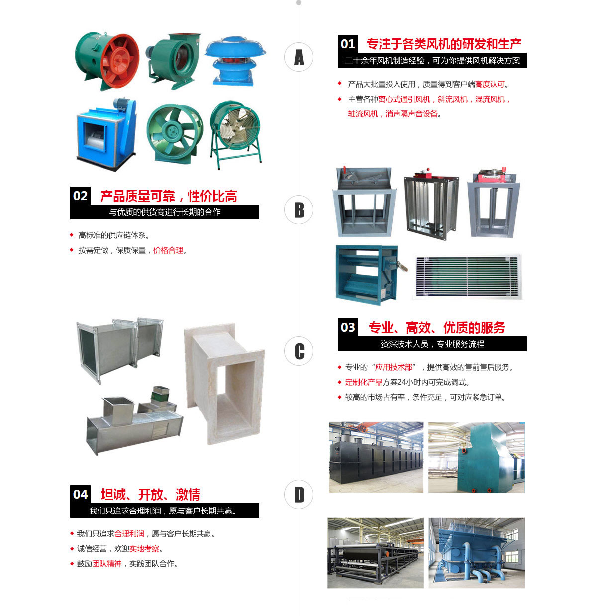 本公司專業(yè)生產(chǎn)各種離心式通引風(fēng)機(jī),斜流風(fēng)機(jī),混流風(fēng)機(jī),軸流風(fēng)機(jī),軸流風(fēng)機(jī),不銹鋼排風(fēng)機(jī),全塑封機(jī),高溫風(fēng)機(jī),消聲隔聲音設(shè)備,以及各種特殊用途的不銹鋼、鈦材、玻璃鋼、塑料及襯膠、貼瓷等不同材質(zhì)的防腐、防爆和耐高溫的高效低能耗新型風(fēng)機(jī)。同時(shí)生產(chǎn)各種水處理、消煙除塵、焚燒爐等環(huán)保設(shè)備設(shè)施。產(chǎn)品廣泛應(yīng)用于鋼鐵、冶金、醫(yī)藥、化工、紡織、煤礦、市政等各行業(yè)。